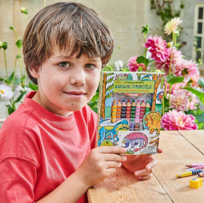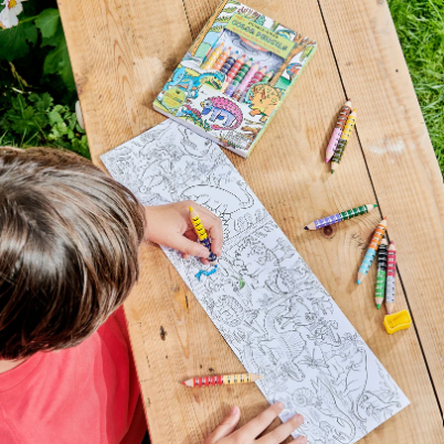 High quality color pencils with 16 colors with a long and detailed fold-out mural to color, filled with dinosaurs and prehistoric plants.