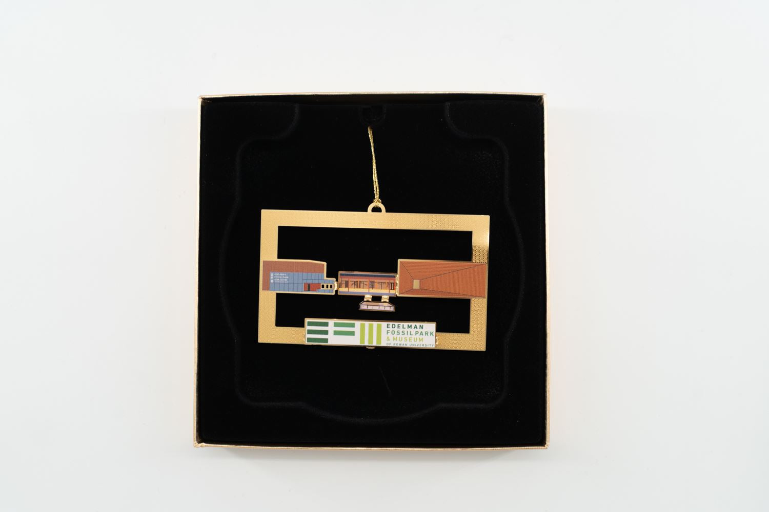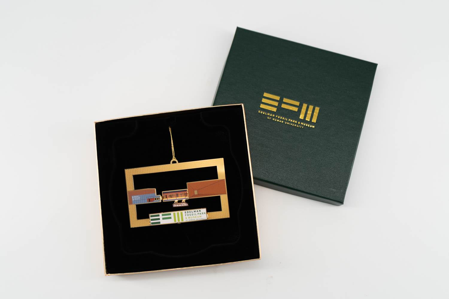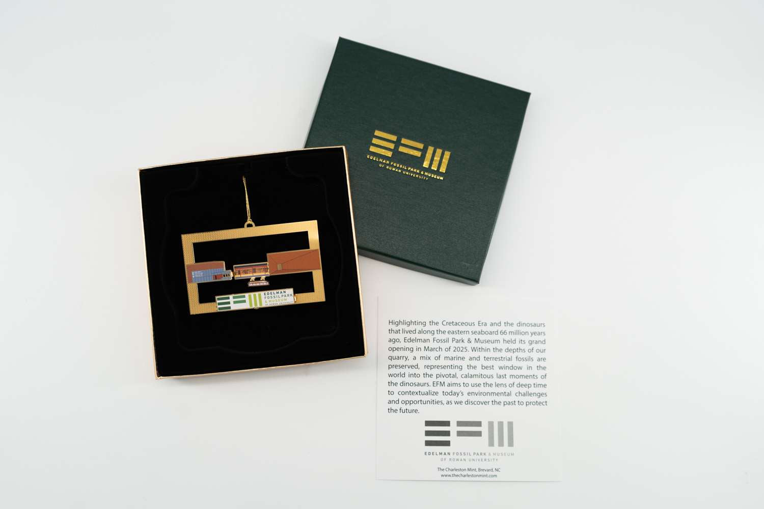 In an effort to celebrate our inaugural year, our EFM Building Ornament showcases the stunning architecture of the museum as viewed from the Quarry. Using gold metal cutouts and full-color highlights, each section of the museum is detailed, celebrating our stunning veranda and the skeletons on view through the windows. Each ornament comes complete with its own custom-embossed box and insert detailing the story of the museum.