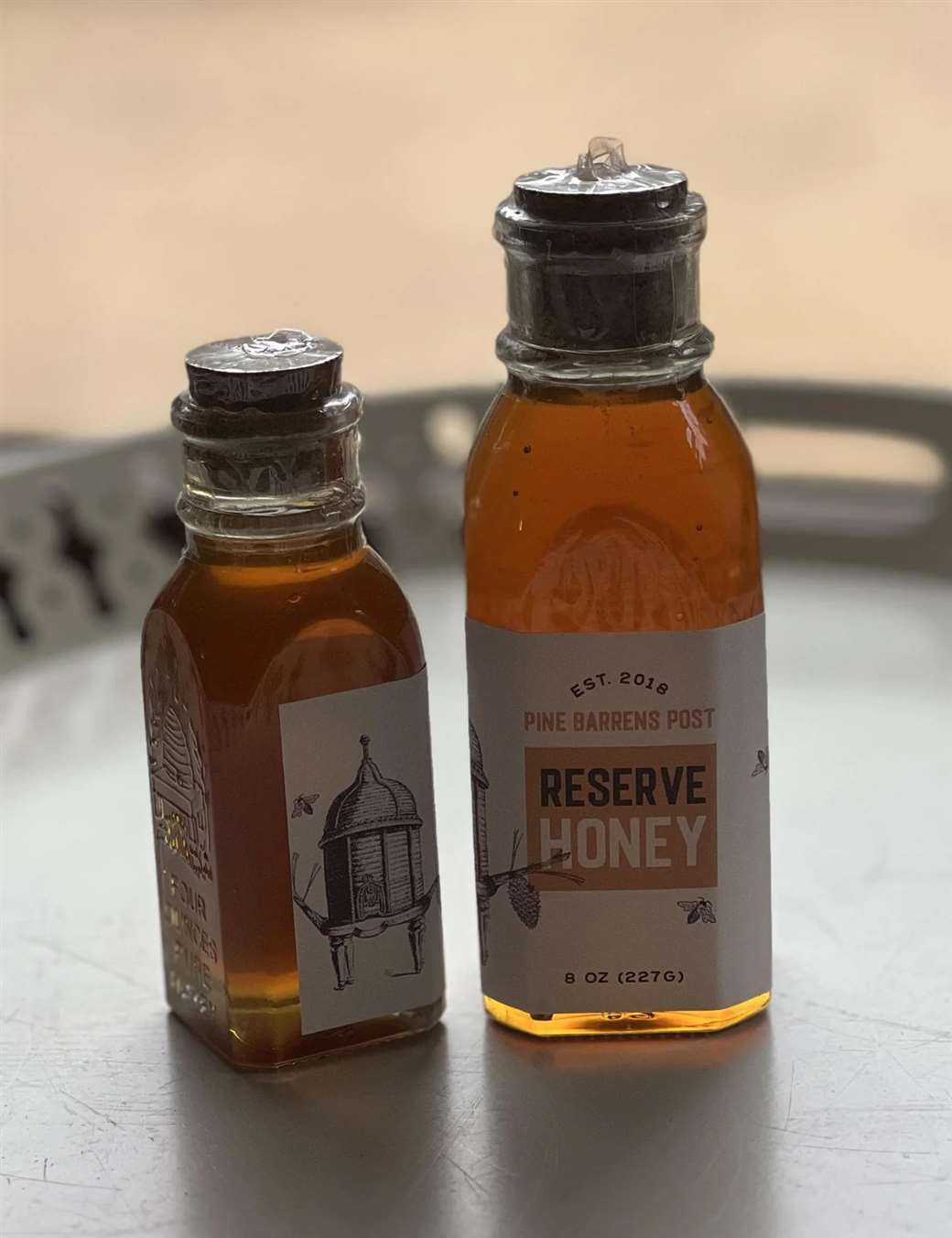 Pure honey from our Pine Barren Posts' 2024 harvest in an ol' fashioned, corked Muth jar. 8 oz.