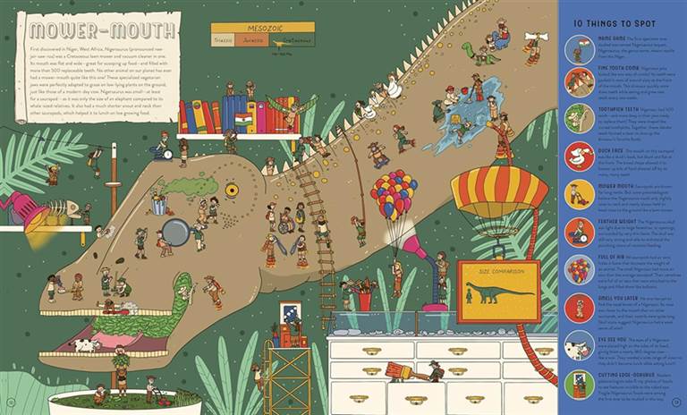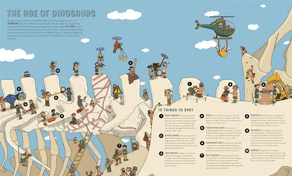 Looking through the magnifying glass, you'll also find scientists spinning plates on Stegosaurus's back, enjoying a spot of fishing with Spinosaurus, and even a paleo-wizard inside Dracorex hogwartsia! You'll reveal new gags again and again among the scrapes, mishaps and wacky experiments of the miniature palaeontologists, where every tiny detail tells a story, and every story reveals more incredible facts about prehistoric creatures.