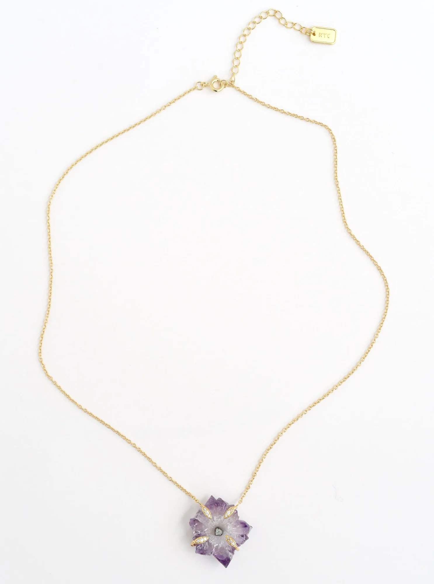 Necklace featuring a one of a kind natural amethyst quartz stalactite flower. This unique stone is formed when the amethyst crystals form on the outside of an agate slice instead of inside of a hollow stone, which creates a geode. Item received may vary slightly from picture as each piece is one of a kind.